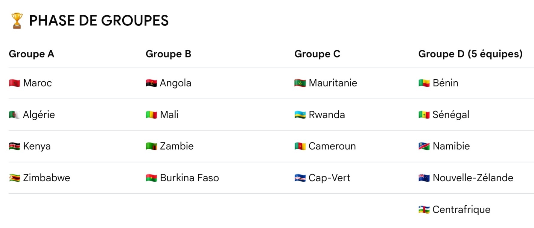 This year's edition is notable for two major facts: the exceptional participation of New Zealand (by invitation) and the inclusion of the Central African federation. As a result, the tournament will be organised around 4 GROUPS: THREE of 4 teams and ONE extended group of 5 teams.