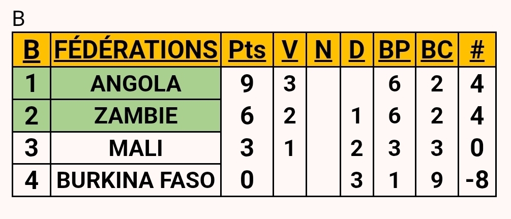 MalgrĂ© sa dĂ©faite, la Zambie parvient Ă valider son billet pour le tour suivant, accompagnant ainsi lâAngola dans la phase Ă Ă©limination directe.