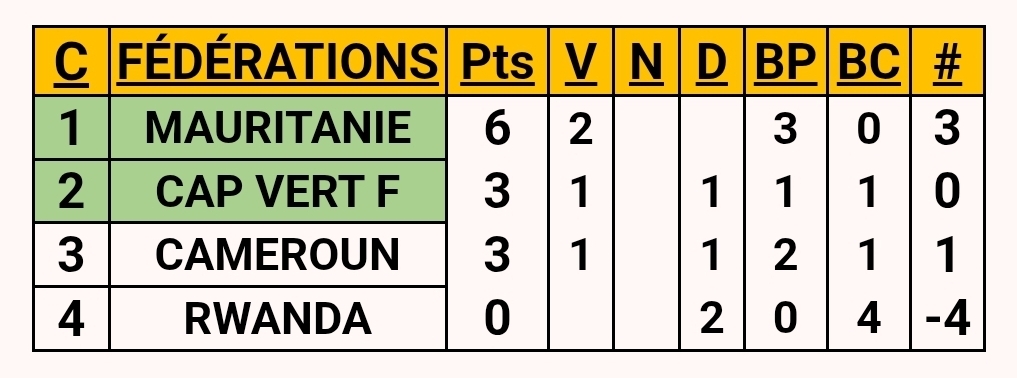 The expected clash between the Blue Sharks and the Indomitable Lions came to an abrupt end before kick-off. Due to an organisational problem in the Cameroon camp, victory was awarded to Cape Verde on a green carpet. The three points on paper mean that the Cape Verdians now lead the group alongside Mauritania, while the Cameroonians already have their backs against the wall for non-sporting reasons.